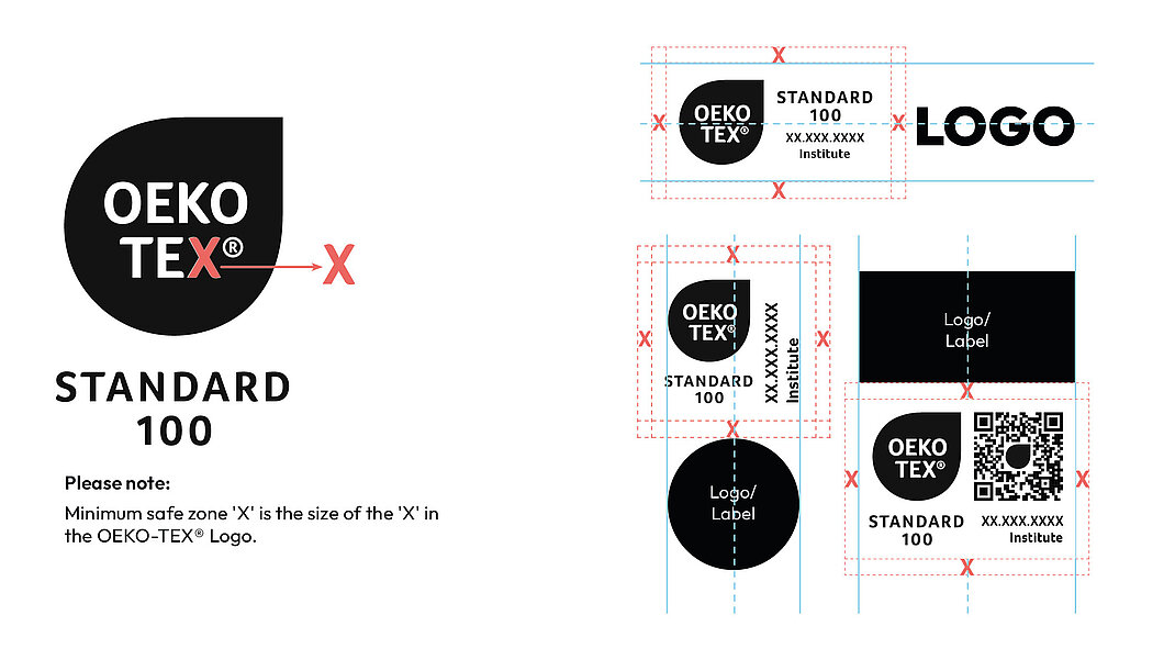 Minimum safe zone 'X' is the size of the 'X' in the OEKO-TEX® Logo.