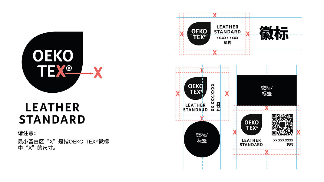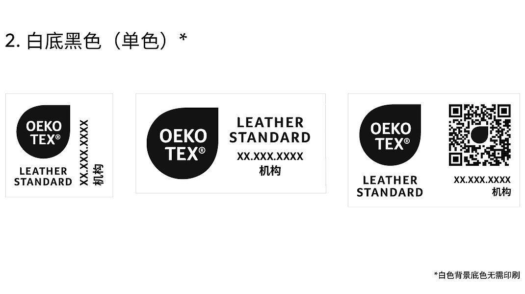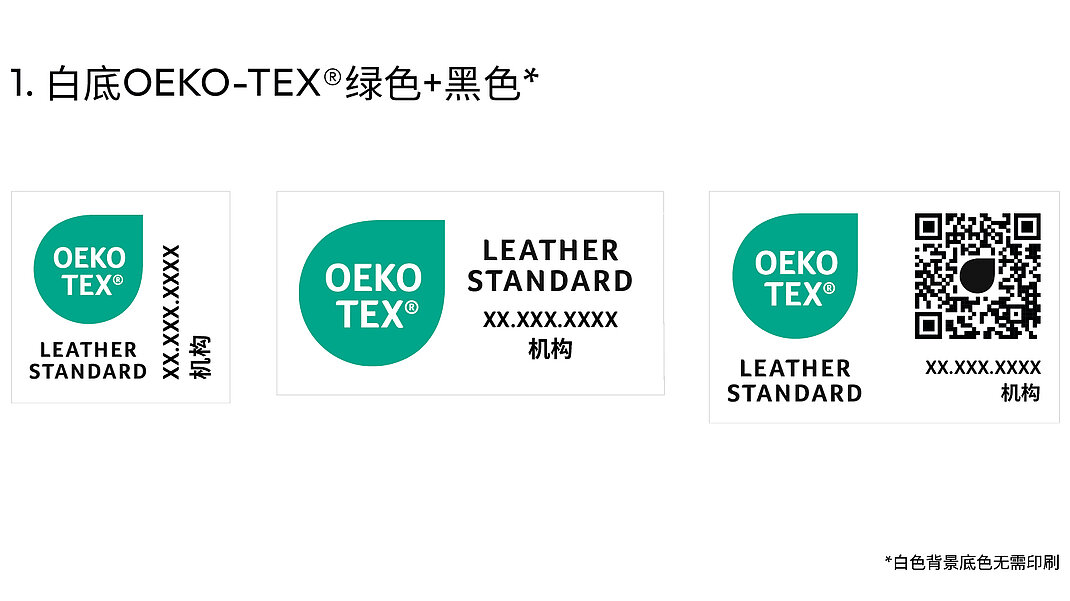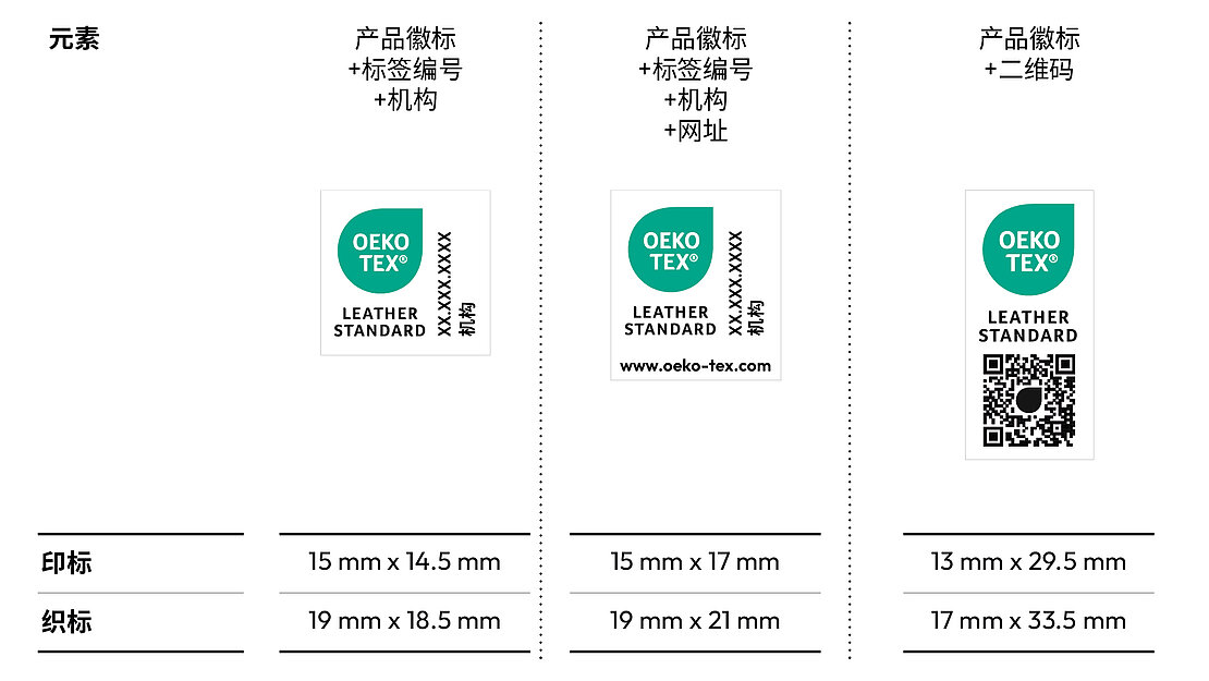 证书持有者可以通过myOEKO-TEX®平台下 载所有标签布局。若要使用其他颜色版本(包 括此处未显示的单色版本),必须先提交到 OEKO-TEX®进行审批。