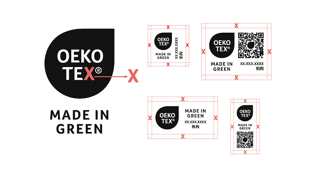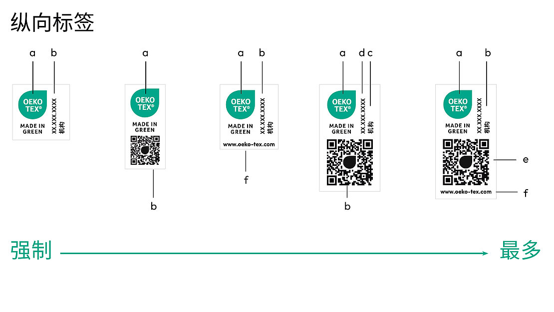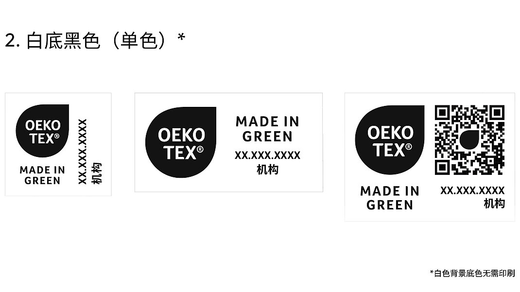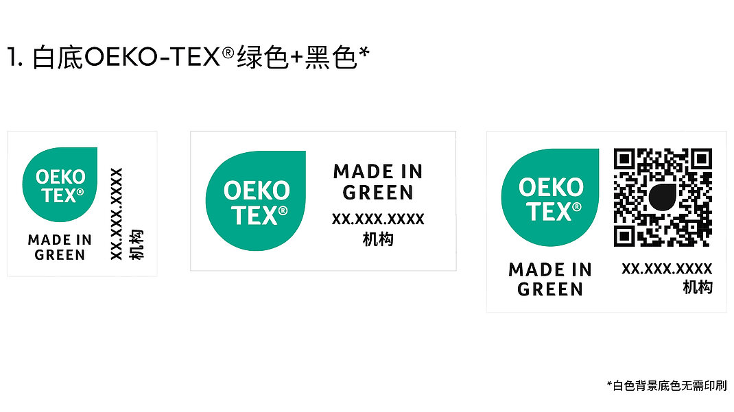 标签持有者可以通过myOEKO-TEX®平台下 载所有标签布局。若要使用其他颜色版本(包 括此处未显示的单色版本),必须先提交到 OEKO-TEX®进行审批。