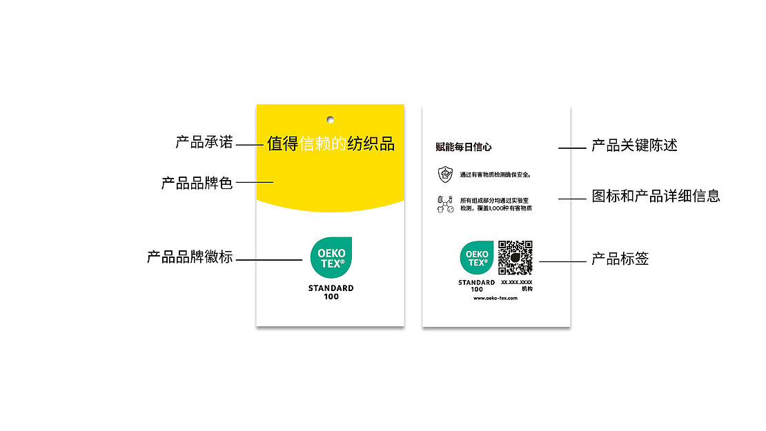 可以在哪里使用?直接用于获得OEKO-TEX® STANDARD 100认证产品上或宣传获得OEKO-TEX® STANDARD 100认证的产品宣传材料上(如宣传册、网站等)。请注意:吊牌不包括任何特定国家/地区的标签要求。吊牌的使用不是强制性的。